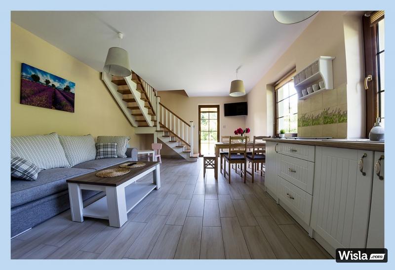 Domek na Leśnej w Wiśle łączy w sobie prostotę i funkcjonalność. W jego skład wchodzą dwa apartamenty, które urządzone są w stylu nowoczesnym i prowansalskim. Oba apartamenty są dwupoziomowe (parter i piętro), posiadają balkony, a wejście do każdego z nich jest odrębne i niezależne. Każdy apartament jest przeznaczony dla 2-5 osób. Dodatkowo istnieje możliwość rozłożenia komfortowej, dwuosobowej kanapy w salonie. W budynku funkcjonuje bezpłatne Wi-Fi.